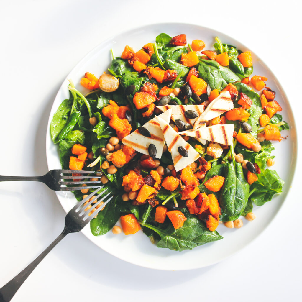 5. U zdjelu stavimo špinat, dodamo slanutak. Začinimo uljem, octom i soli. Na kraju dodamo buču i sve promiješamo.
